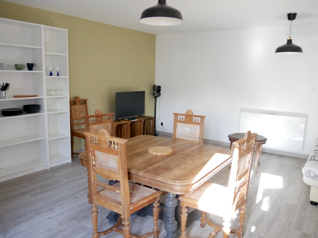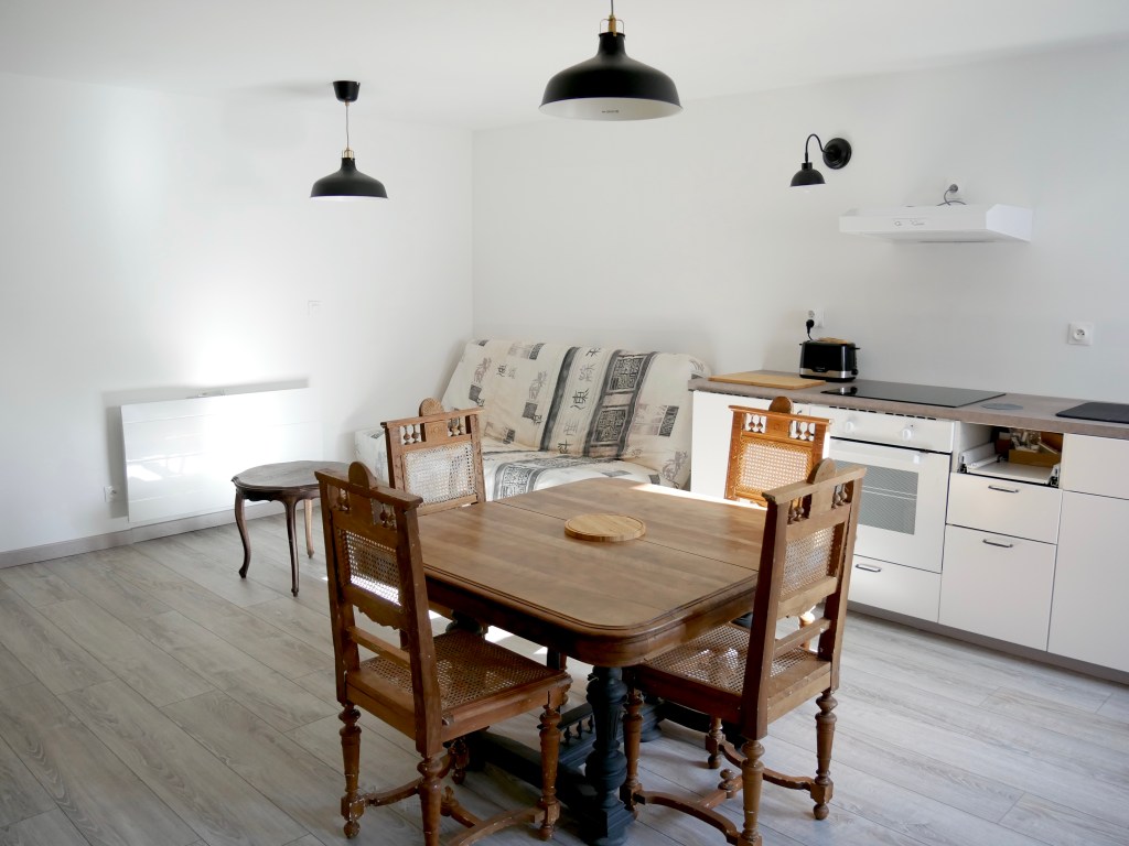 24m2 pour une grande pièce à vivre lumineuse, 6 places à table, cuisine équipée, canapé et télévision