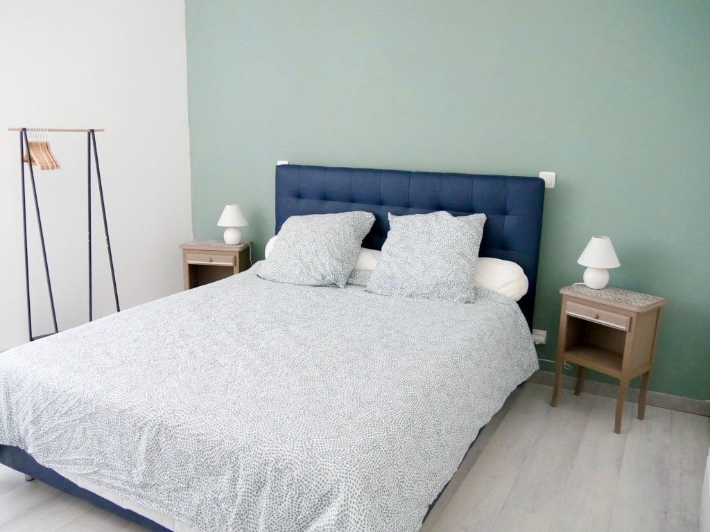 Une grande chambre lumineuse avec un grand lit confortable en 160cm, commode et penderie