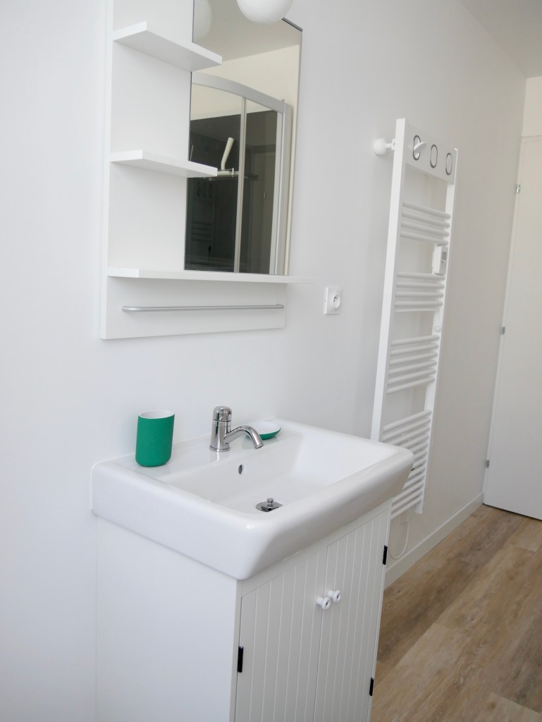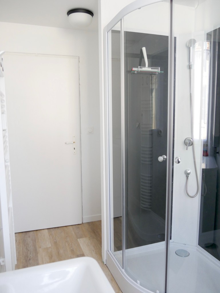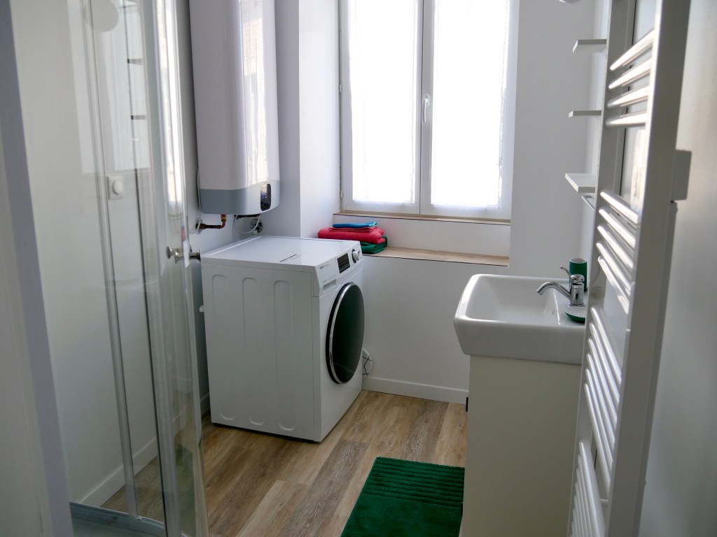La salle de bain très lumineuse est suffisamment spacieuse, une grande cabine de douche, les wc séparés, un radiateur sèche serviette dernière génération et une machine à laver séchante performante. Vous ne serez jamais en panne d’eau chaude grâce au grand chauffe eau à production instantanée