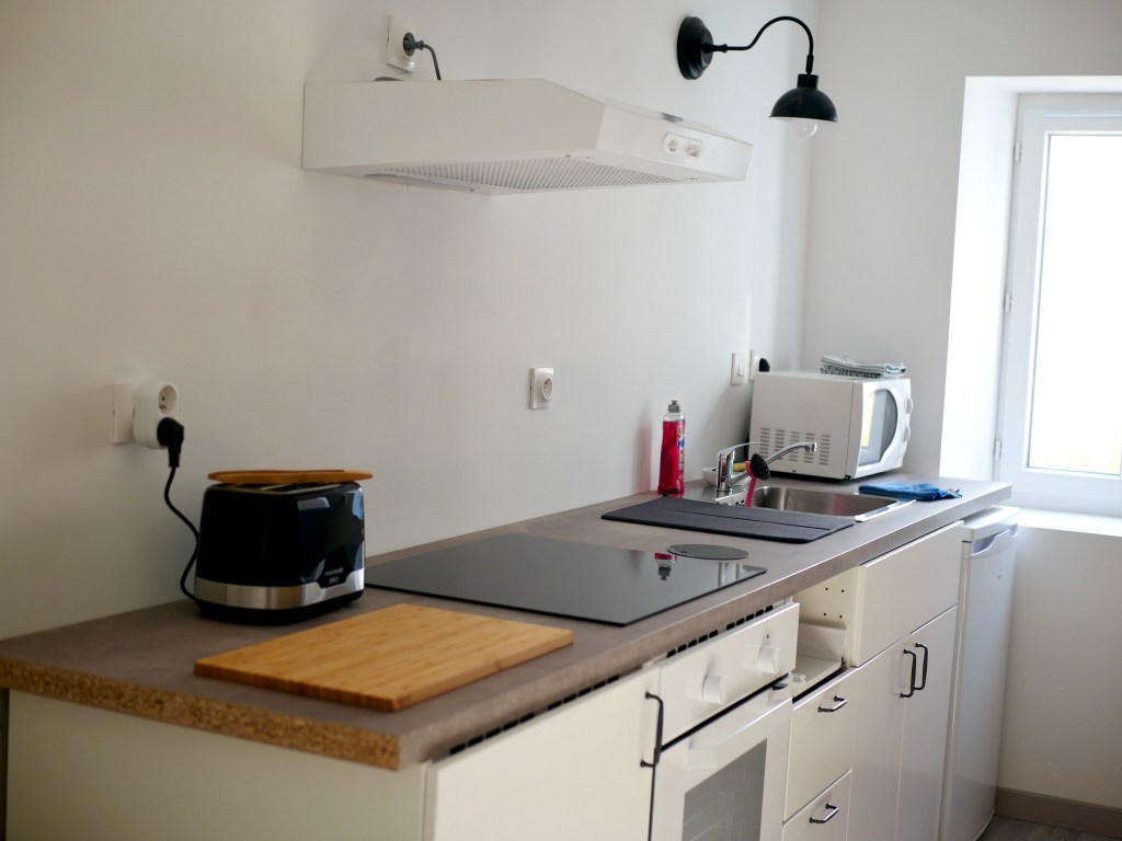 Frigo, grand four, four micro-onde, cafetière (classique programmable et isotherme +. nespresso), grille pain, bouilloire, hotte et tout ce qu’il faut en vaisselle, plats et casseroles, même la crêpière et l’appareil à raclette y sont !
